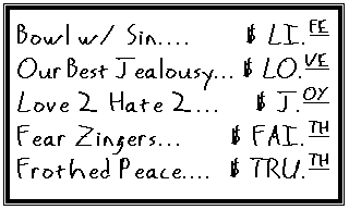 DUELY: [with raised voice] Yeah. I'll have that Bowl of Sin. And, bring me a glass of Peace!